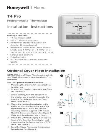 Web summary of contents for honeywell home t4 pro. Page 1 t4 pro programmable thermostat user guide package includes: T4 pro thermostat uwp™ mounting system.